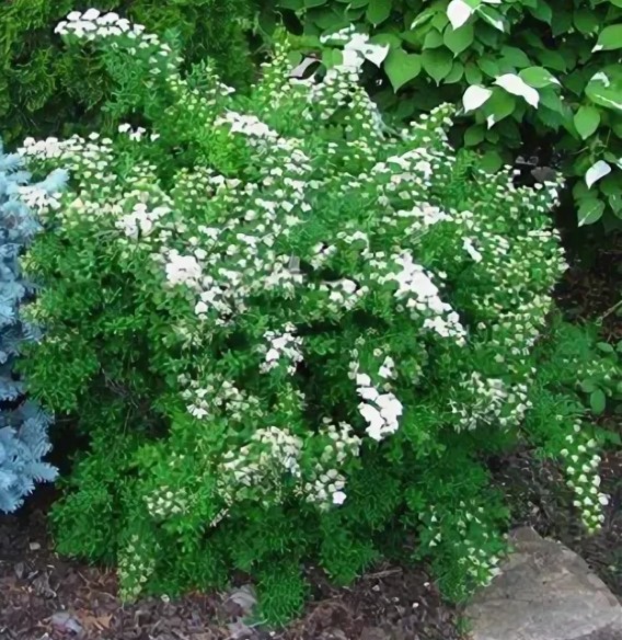 2. Декоративность: Шаровидная форма куста и белоснежные цветки придают саду элегантный вид.